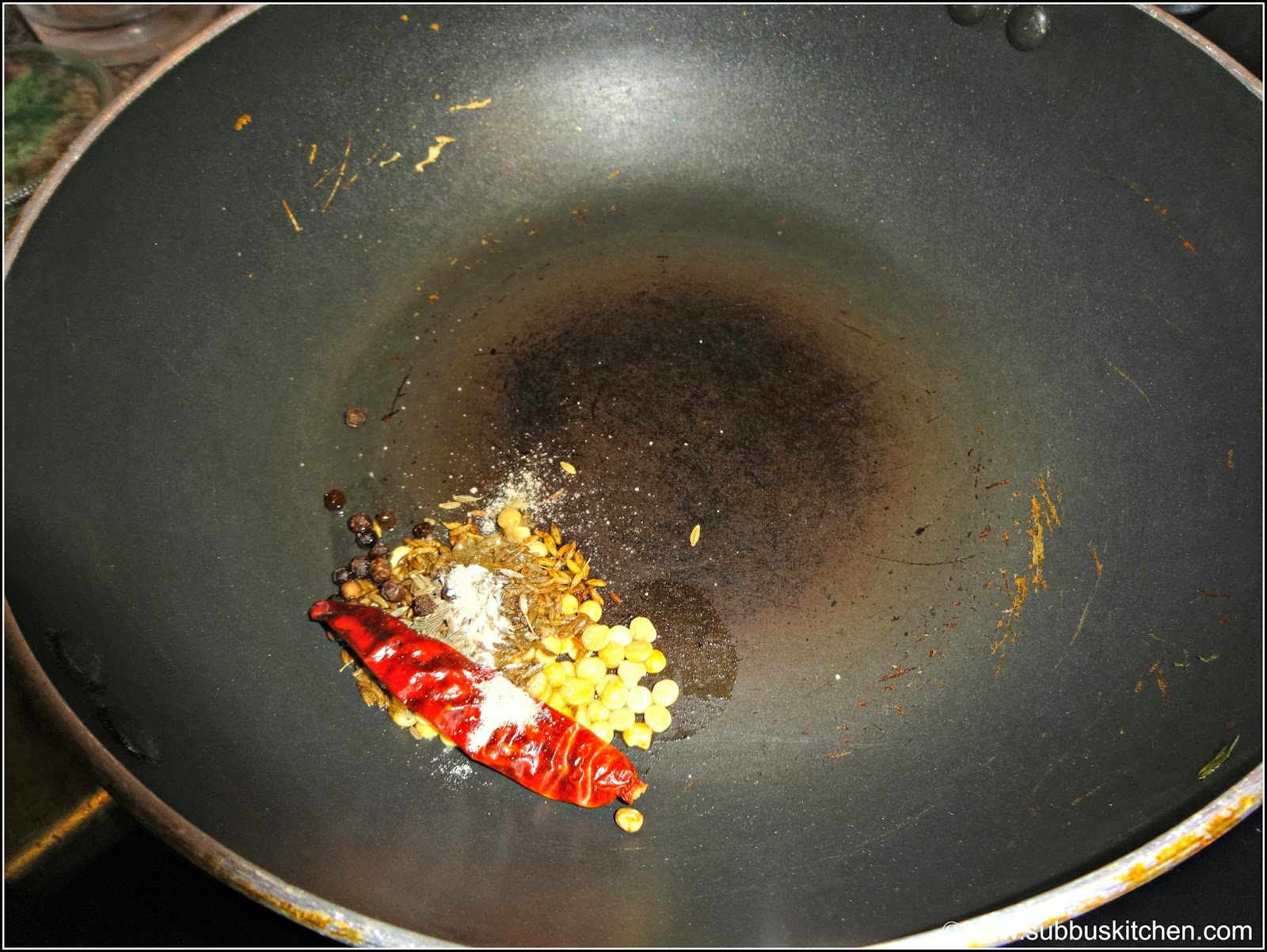- Heat ghee in a pan and add the grinding ingredients. Fry it till the thurdal becomes slight brown color. Remove from heat and add it to a mixer along with coconut and allow them to cool off