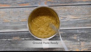 - Heat another pan, add the ground spice paste. If the paste is thick, add a cup of water. We can use the leftover soaked water also. Keep the flame in low and cook the ground paste for about 5 minutes