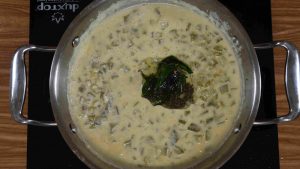 - Meanwhile, in another pan, heat oil. Add mustard seeds and allow it to sputter. Add curry leaves to the pan and add this tempering to the boiling stew and switch off the flame. Finally add a teaspoon of coconut oil for seasoning. The coconut oil added at last gives a nice flavor and aroma to the whole stew.