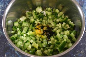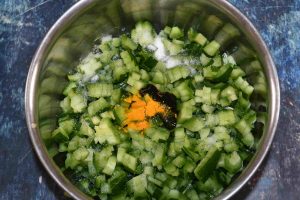 - Wash and soak the gram dal in water for 20 mins Meanwhile, take the chopped snake gourd in a vessel. Add tamarind paste, turmeric powder and salt and give a good stir.