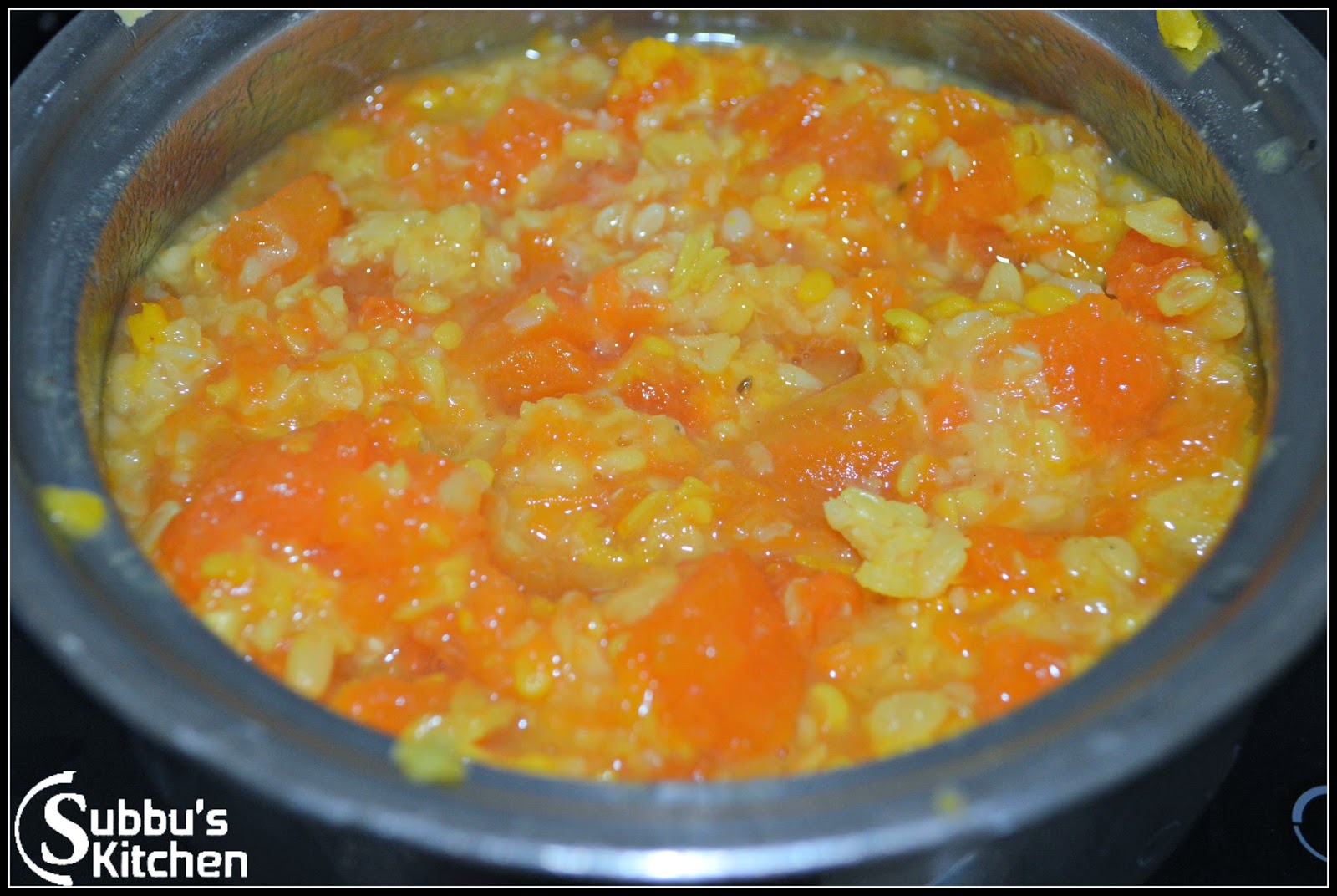 - Cook moong dal along with pumpkin, salt and turmeric powder in pressure cooker over 2-3 whistles. Generally pumpkin get easily cooked on stove top itself. So we can verymuch cook the dal alone in pressure cooker and cook the vegetable in the stove-top. To save time i prefer to cook both moong dal and pumpkin together in pressure cooker.