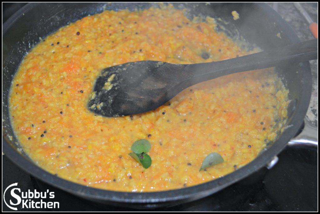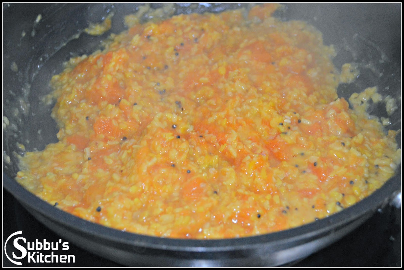 - Heat a pan. Add oil and when the oil is hot, add mustard seeds. When the mustard seeds starts to sputter, add curry leaves and add cooked dal and pumpkin and mix well.