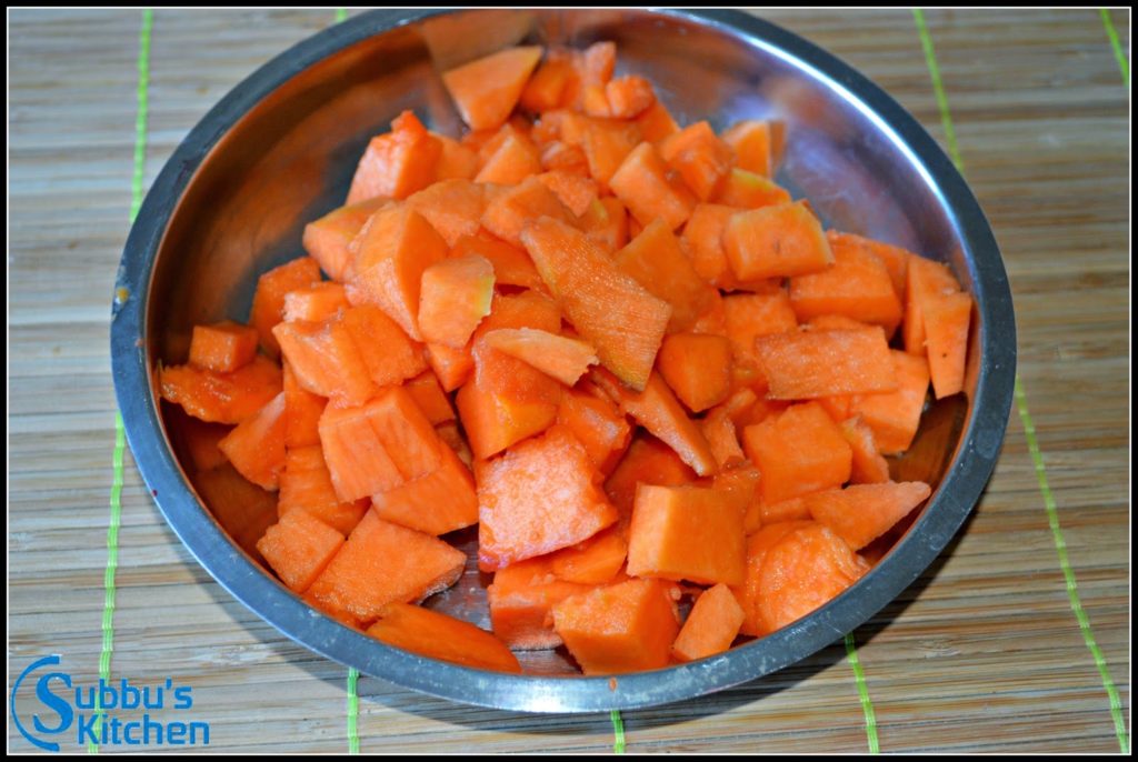 - Peel the skin of the pumpkin and chop the pumpkin into small pieces.
