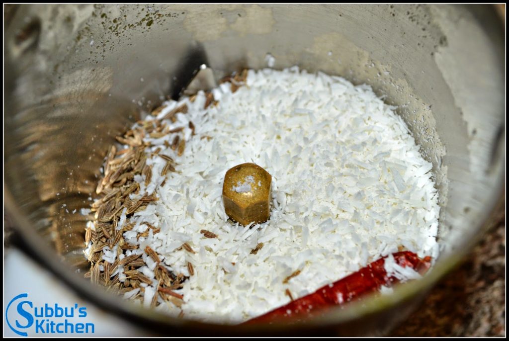 - Grind all the grinding ingredients (Grated coconut, Red Chili, Cumin Seeds) to a nice powder. Grind it without adding water (dry grinding)