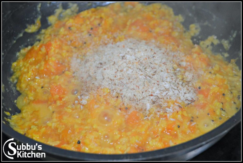 - Grind all the grinding ingredients to a nice powder or paste. Heat a pan and add oil and when the oil is hot, add mustard seeds. When the mustard seeds starts to sputter, add curry leaves and add cooked dal and pumpkin and mix well.