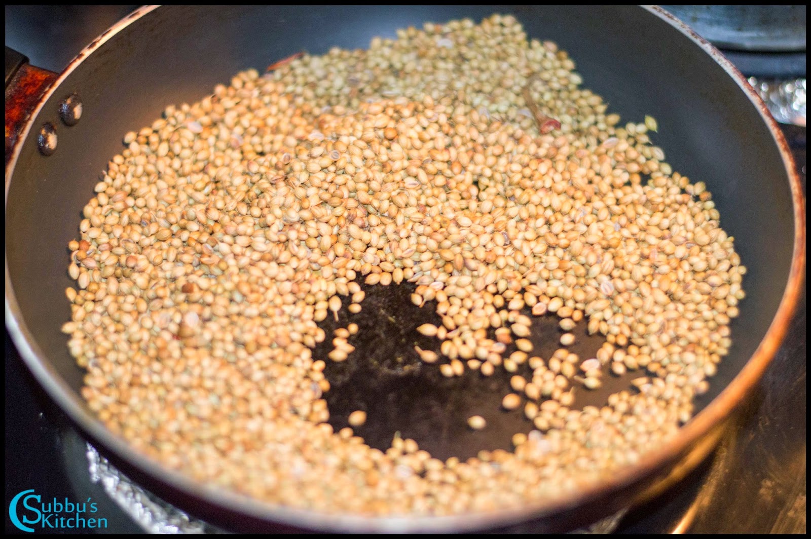 - Heat a pan and add each ingredient separately and fry them till they are warm. If you are in a sunny country, then we can spread all the ingredients in a paper and dry it under sun for couple of hours and then grind it to a nice powder in a mill