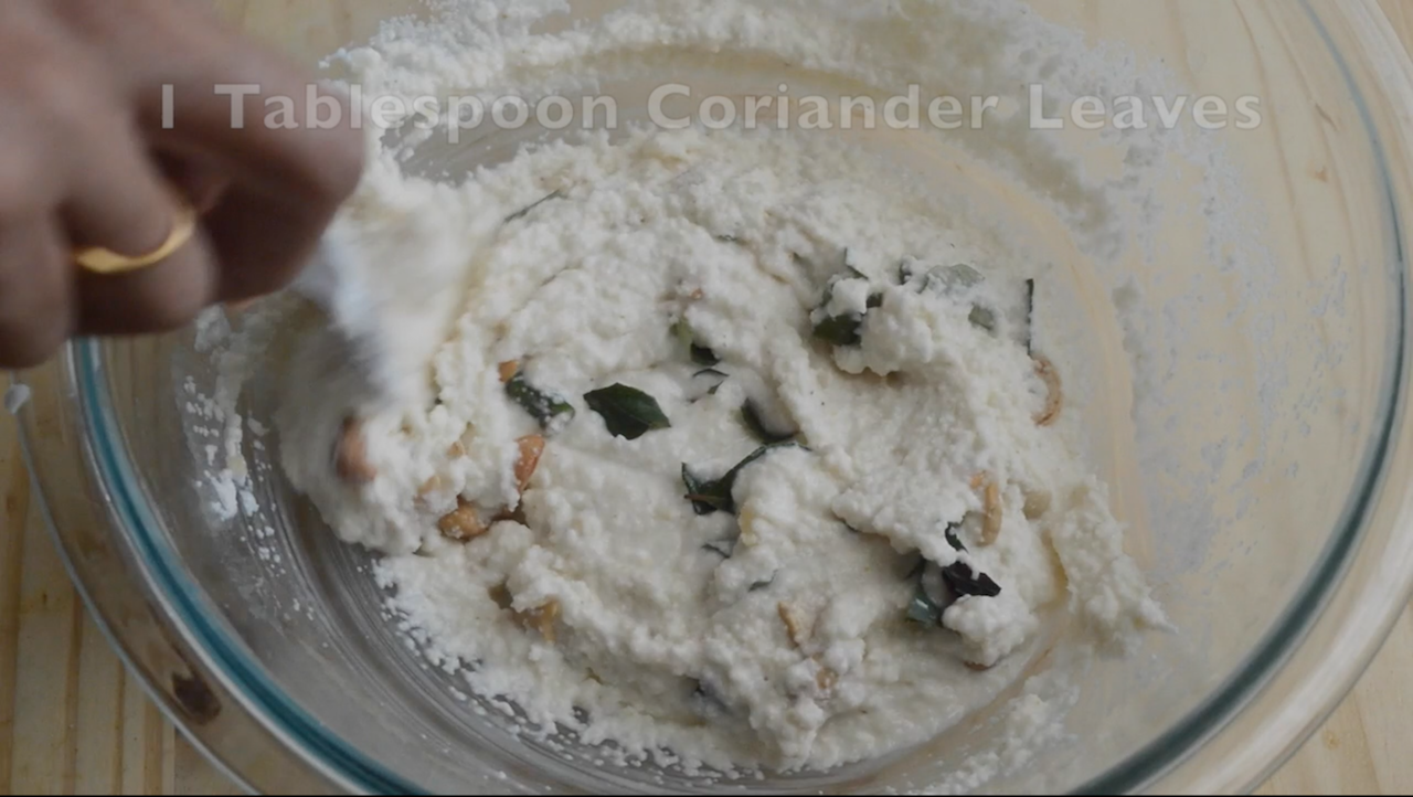 • To this add broken cashew nuts, chopped green chillies, ginger and curry leaves and coriander leaves along with pepper powder. Leave this mixture for 30 mins
