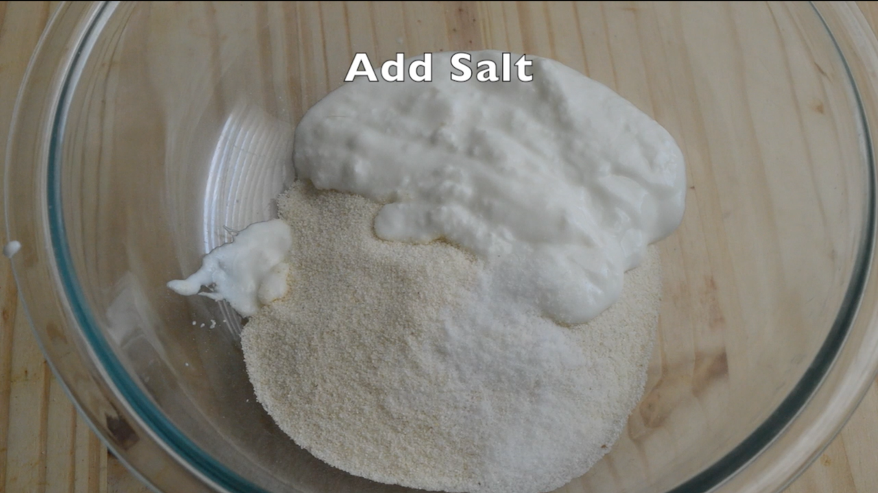 • Mix salt, rawa and sour curd and add required water along with a pinch of hing and stir it well to make it a tight paste(neither too thick nor too thin).