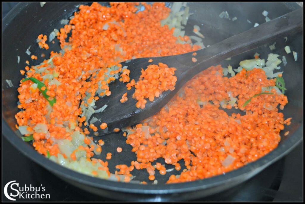 - Finely chop the onions. Heat oil in a pan and finely chopped onions, garlic, ginger and sliced green chilli. Sprinkle little salt and saute the onions till they turn soft but not brown. The addition of salt brings out moisture from onions and helps to saute the onions evenly with less oil. When the onions are cooked and become soft and transparent, add rinsed dal to the onions