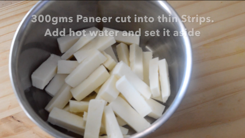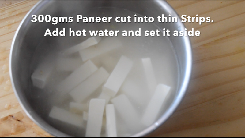 - Cut Paneer into thin strips and add hot water to soak the paneer pieces and cover and set it aside