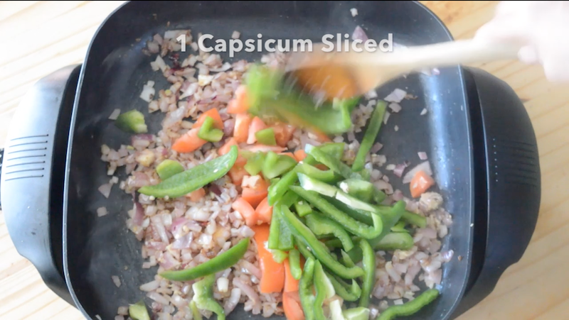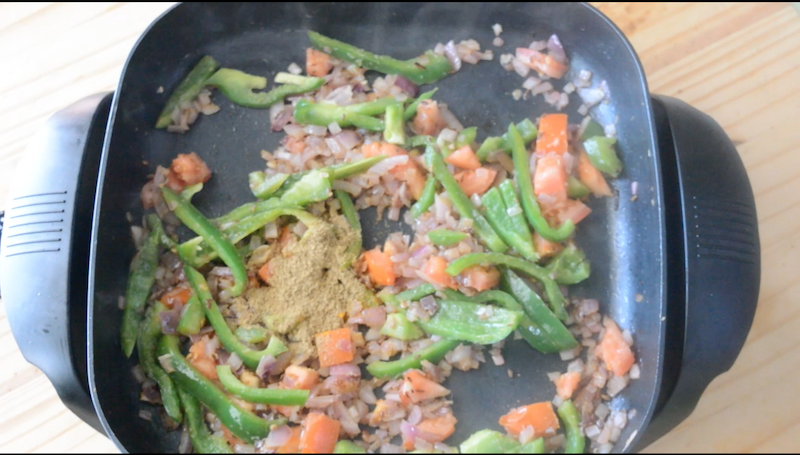 - Then, add tomato and capsicum slices to the pan. Add turmeric powder, coriander powder and saute the tomato & capsicum for couple of minutes.