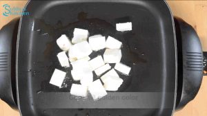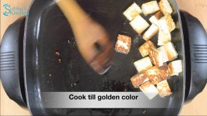- Heat oil/ghee in a pan. Add paneer cubes and sauté them till they are golden color in all sides. Flip them regularly so that they don't get burnt.