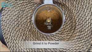 - Switch off the flame. Cool the roasted ingredients and add it to mixer jar. Grind it to smooth powder and set this powder aside
