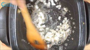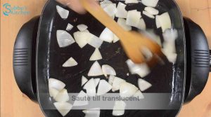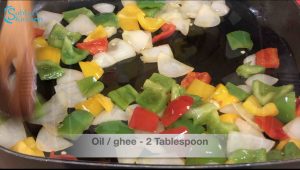 - In the same pan add the cubed onions and sauté till translucent. Add the cubed bell peppers and sauté them for 3 mins. Do not over cook. The crunchiness of the bell peppers enhance the flavor. Set these sautéed veggies aside
