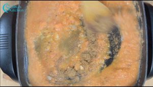 - Then add tomato puree to the pan. Add turmeric powder, kashmiri red chili powder and ground Kadai Masala Powder and give a mix.