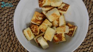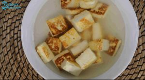 - Take out these fried paneer and add hot water to it and set it aside. Soaking paneer in hot water helps to retain their softness