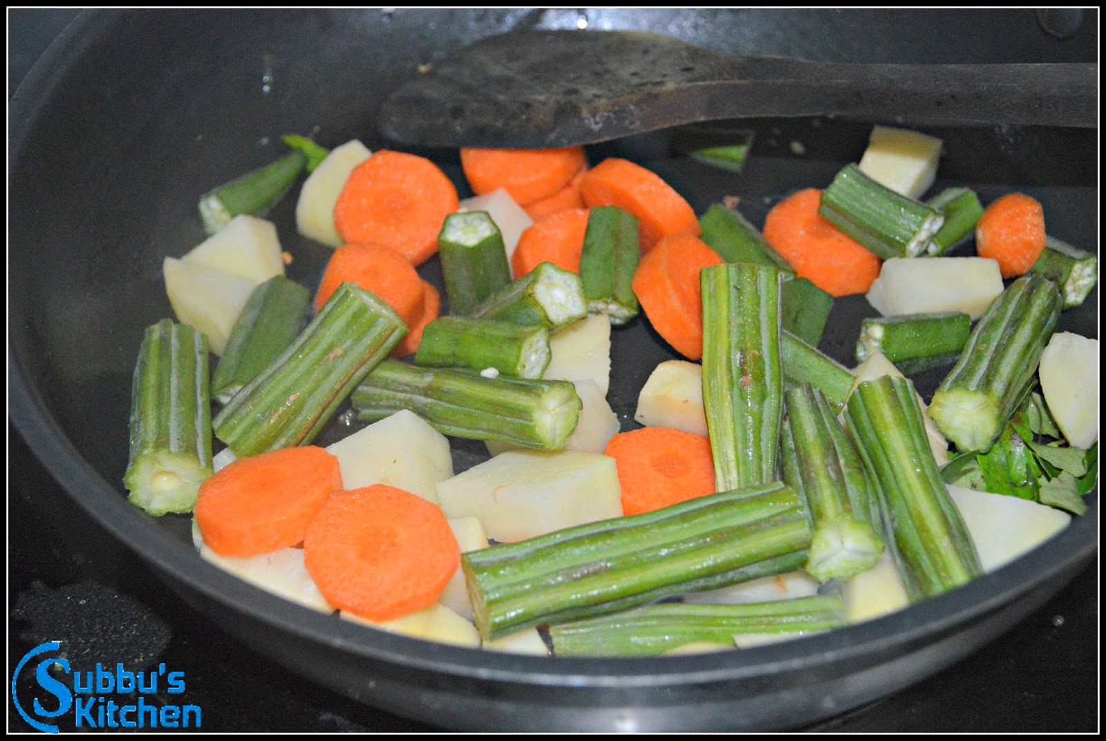 - Add tomato along with other veggies and saute for 2 mins. Add 1 cup water and cook the vegetables till they are cooked. Drumstick vegetables won't cook any further once tamarind is added. Please ensure that the vegetable is cooked before adding the tamarind