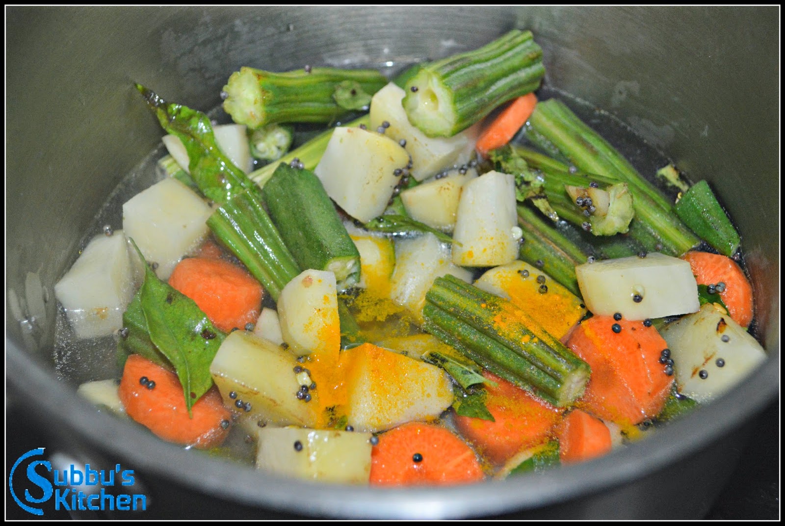 - When the vegitables are cooked add tamarind extract along with salt and asafoetida. Allow the tamarind to boil (for about 5 minutes in medium flame) till its raw smell goes off