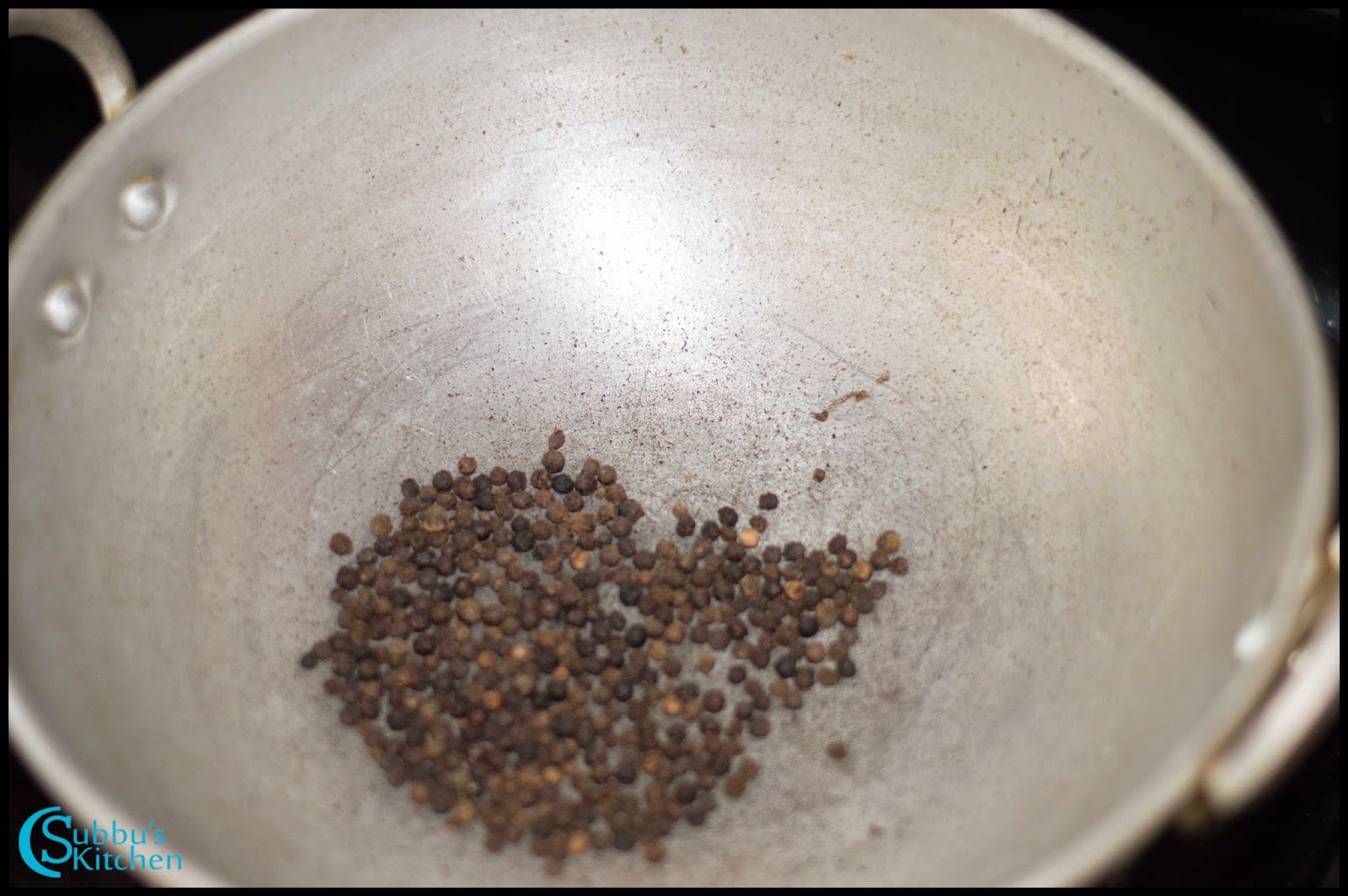 - Next, heat up the peppercorns and take it aside. Then, add channa dal and dry roast it till they are hot.