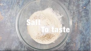 - In a mixing bowl, add maida, carom seeds, salt and mix well. Add Ghee and mix ghee with the maida thoroughly.