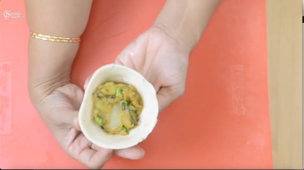 - Add 2 teaspoon of potato filling inside the pocket. After adding potato filling, apply water again on the open sides