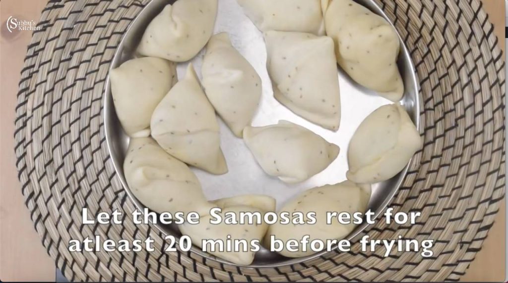 - Allow the samosas to dry out completely for about 20 mins. This is very much important step. Without the samosas getting dry before deep frying, this will prevent the bubbles when we are deep frying the samosas.