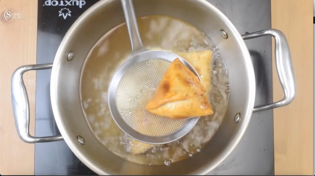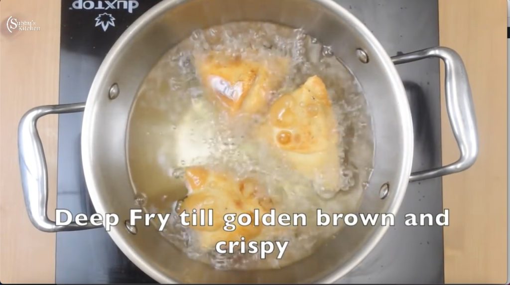 - Fry the samosa in low flame to make sure the crust is cooked and its nice and golden. High flame makes the crust more darker and sometimes we get air bubbles.