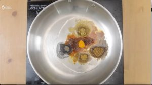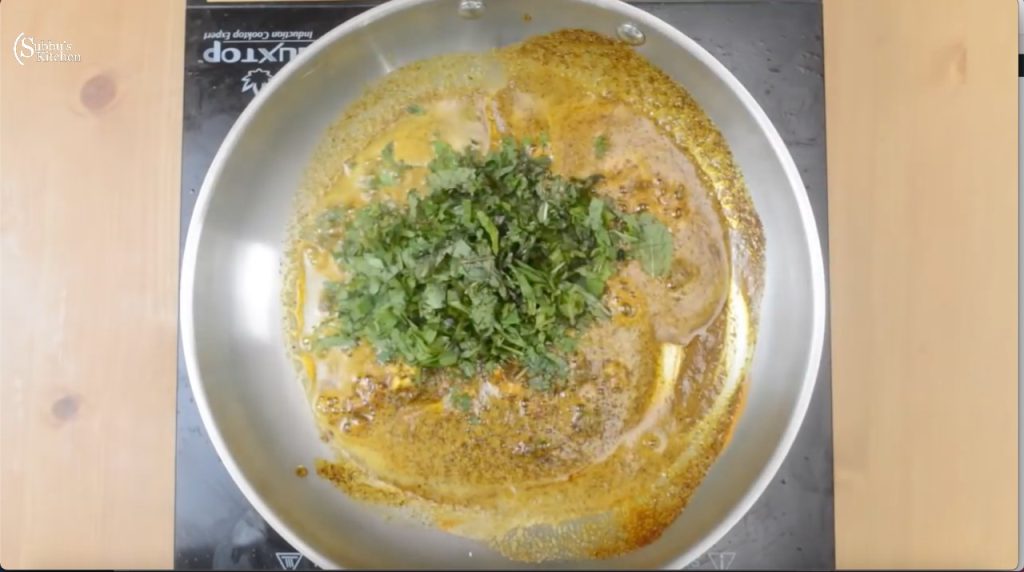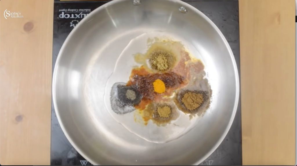 - Heat oil in a pan. Add the dry powders (cumin powder, coriander powder, red chili powder, turmeric powder, pepper powder & garam masala) and sauté in oil for a minute.