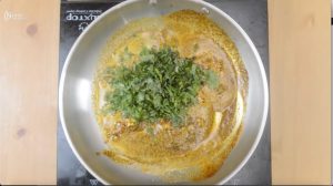 - Heat oil in a pan. Add the dry powders (cumin powder, coriander powder, red chili powder, turmeric powder, pepper powder & garam masala) and sauté in oil for a minute. Add chopped green chili and ginger and sauté them.