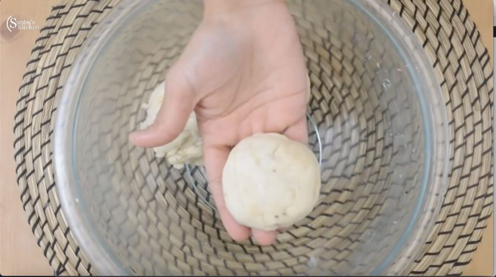 - After an hour, knead the dough again for a minute. Take a big lemon size dough and bring the edges together and make it like a ball.