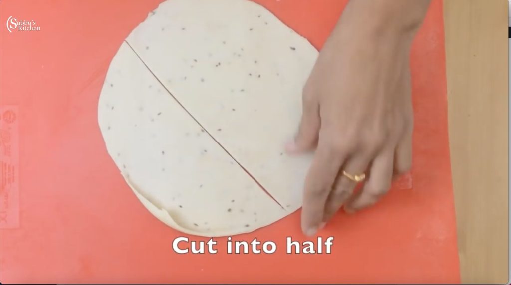 - Using a rolling pin, roll out the dough ball to a thin roti. Make sure the center and edges are thin. Using a knife, cut the rolled roti in half.