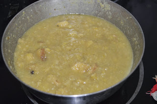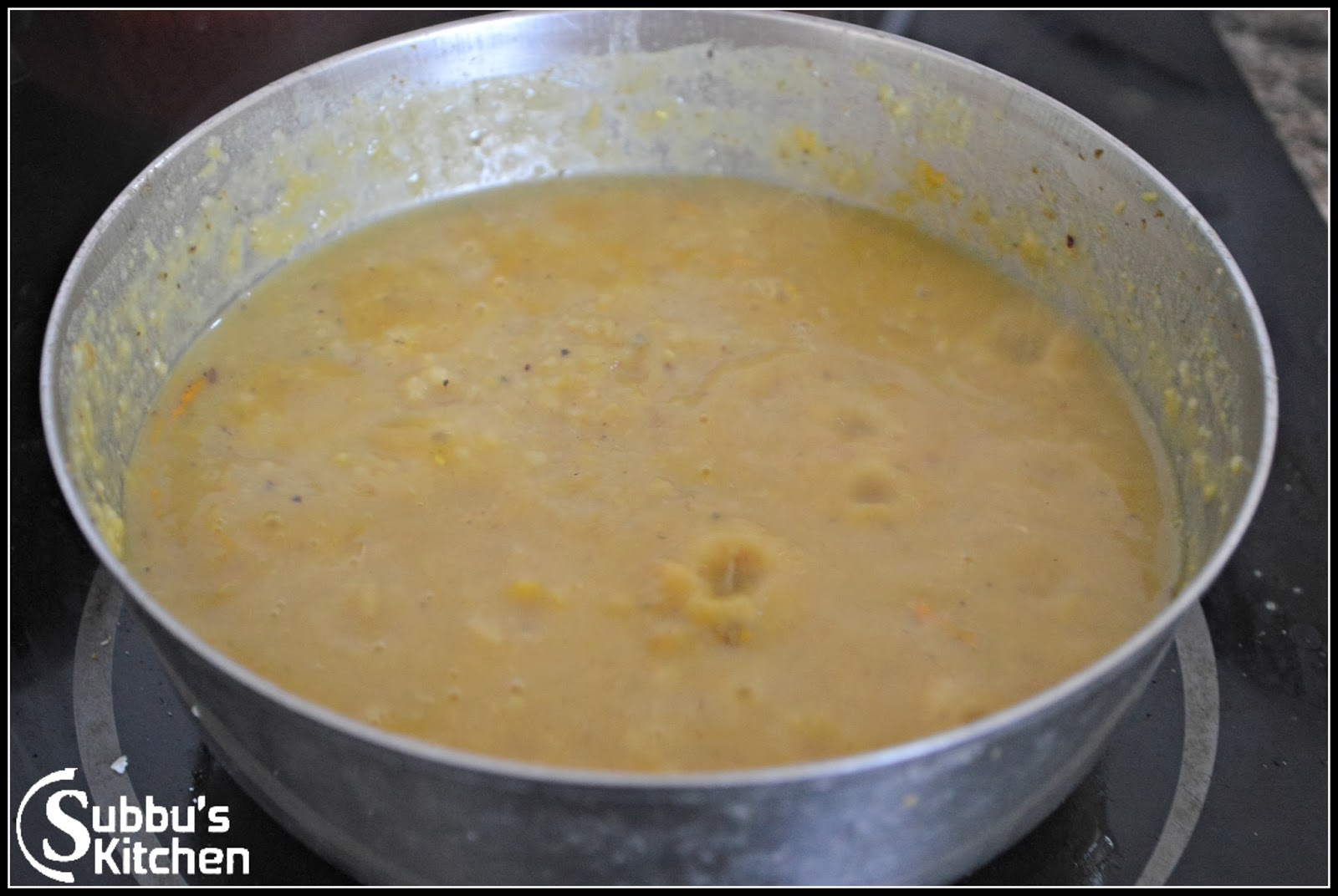 - In a pan, mix the cooked (and mashed) dal and yam. To this add salt and mix well. Start the heat and bring this mixture to boil. Once it start to boil bring the fame to low.