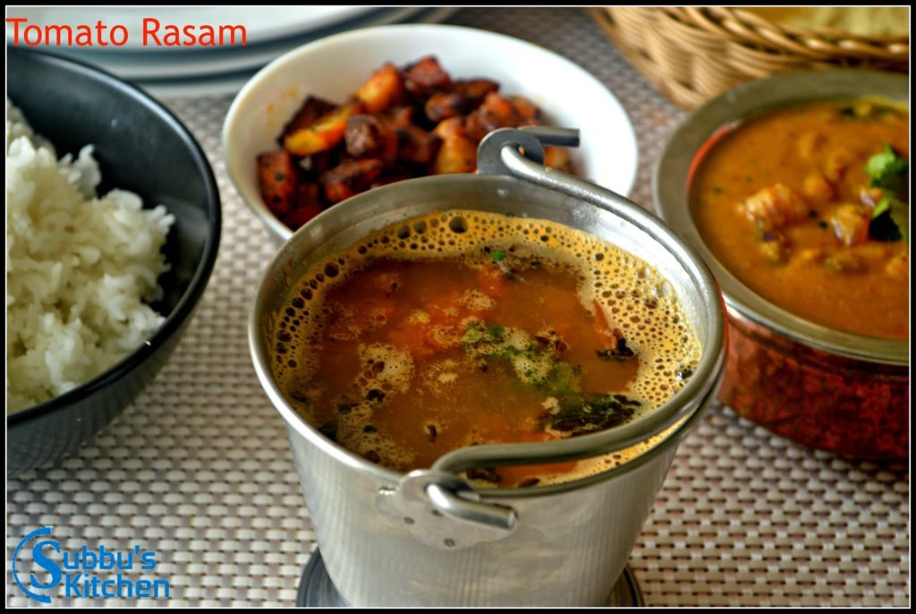 This is my favourite Sunday menu. The kitchen will be filled with the good aroma of the shallots onion(small onion) cooked with freshly ground sambar masala. I preferred to have the potato curry as a side dish for the vengaya(onion) sambar. Mixing little ghee with hot steaming rice along with vengaya sambar is delicious. Indeed the Tomato Rasam is a perfect accomplishment to this menu and increase the richness. When our platter is ready, we can fry some papad or appalam and serve them!