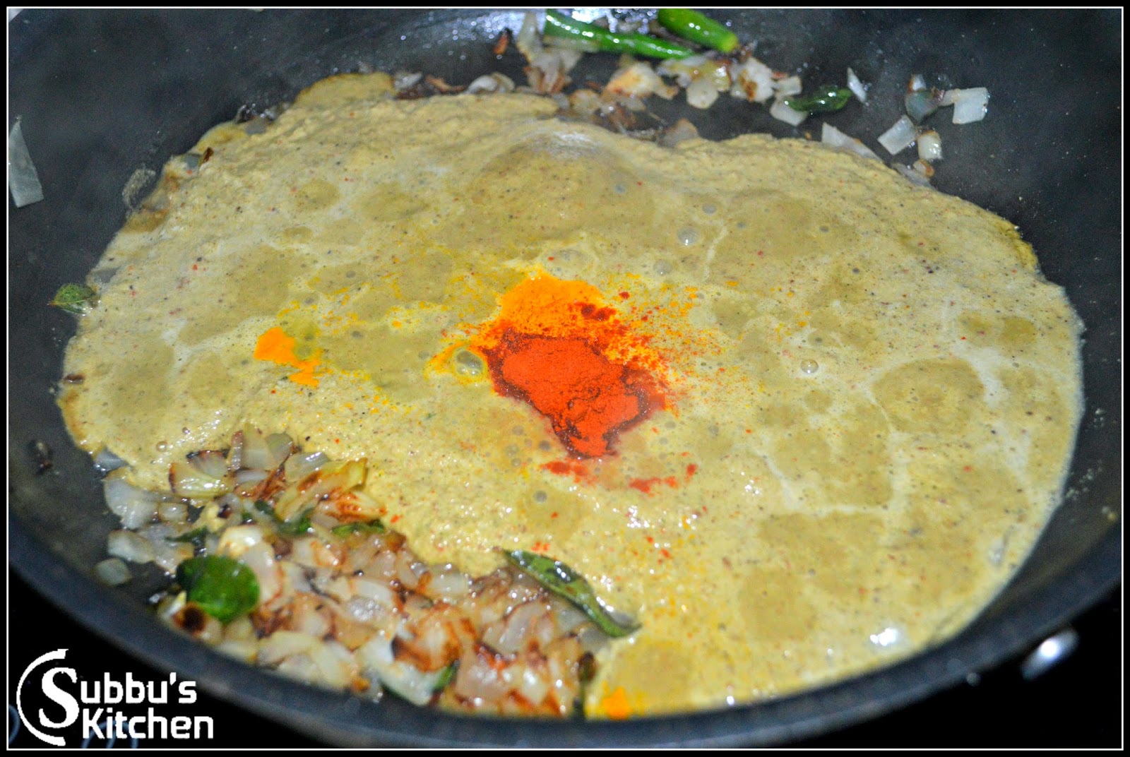 - Heat oil or butter in a pan, add curry leaves and chopped onion and green chilli along with pinch of salt. Saute the onions till they become golden brown color. Then add masala paste along with turmeric powder and paprika powder and mix well. Keep the flame in medium and allow it to boil for 10 minutes as the masala paste is very raw.