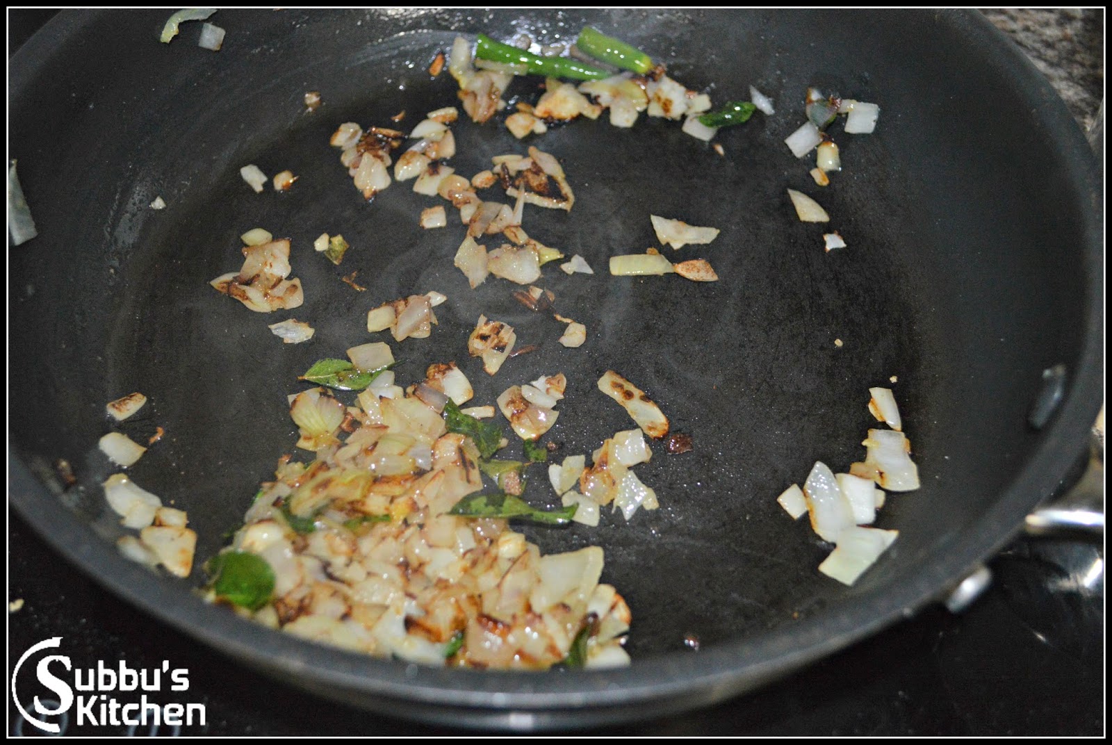 - Heat oil or butter in a pan, add curry leaves and chopped onion and green chilli along with pinch of salt.