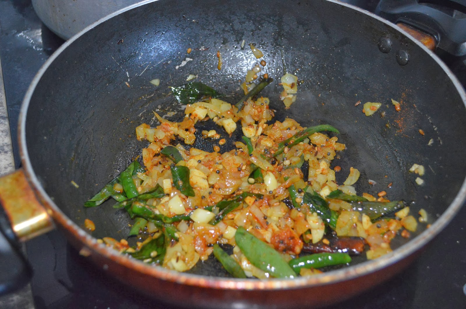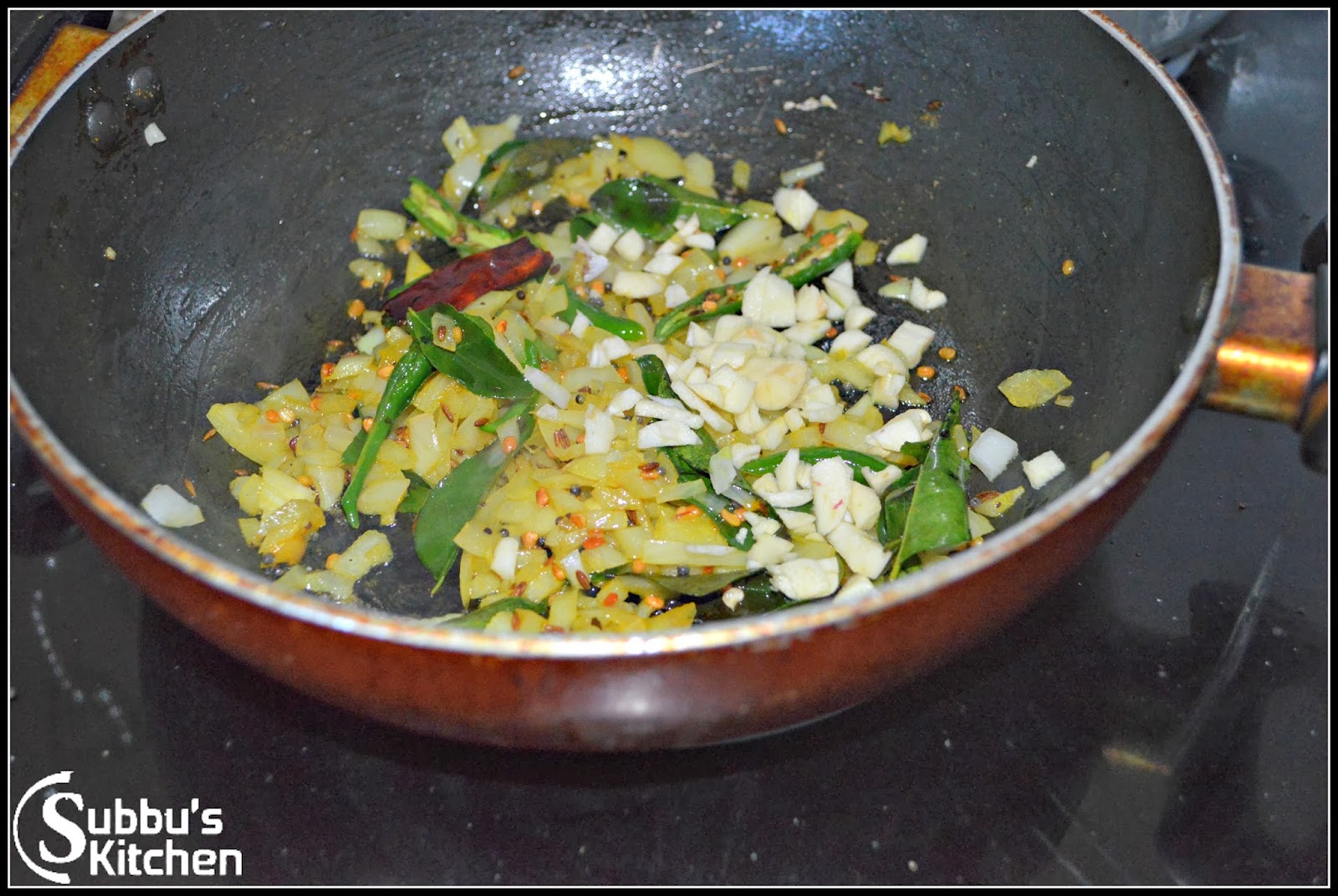 - Finely chop the onions and garlic and keep it ready. Slit the green chillies into thin slices. Heat oil in a pan and add mustard seeds. When the mustard seeds starts to sputter, add cumin seeds and split urid dal and saute them till the dals turns golden brown color. Add broken red chillies and fry for 5 seconds