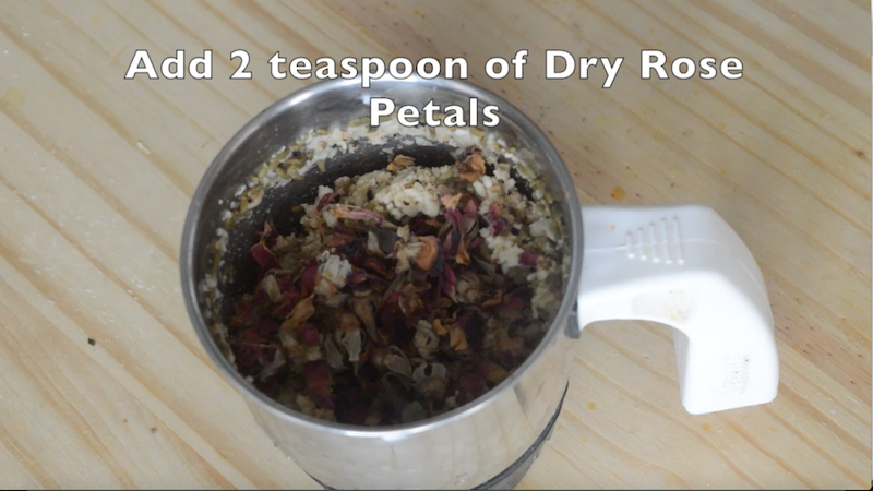 - Add dry rose petals to the mixer jar. If you don't have it, you can replace with 4 drops of rose essence or 2 teaspoon rose water and grind everything to a smooth paste
