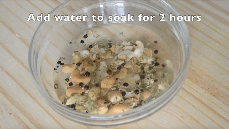 - In another bowl, add cashews, poppy seeds, fennel seeds, peppercorns, green cardamom and add water and soak it for 2 hours.