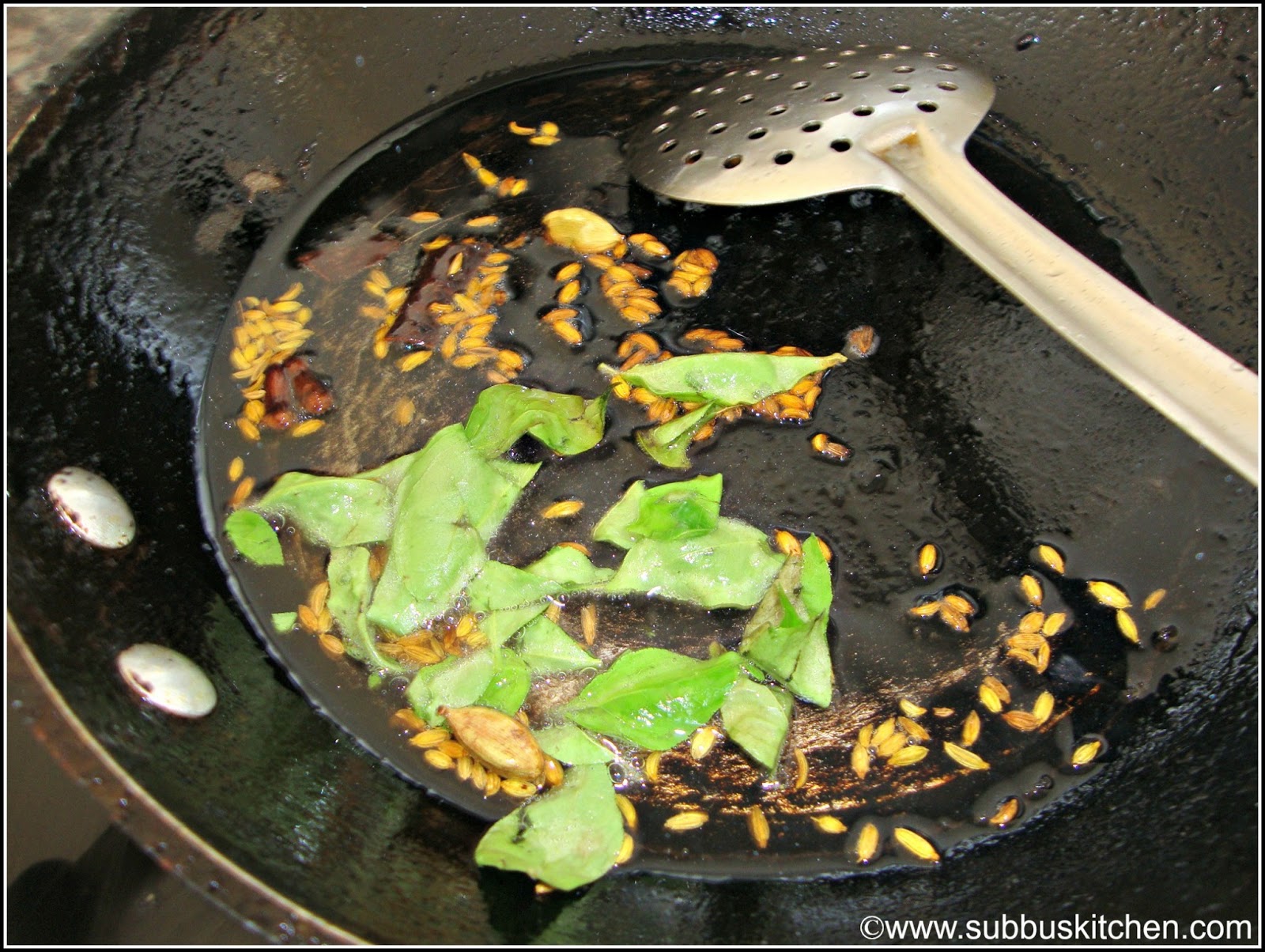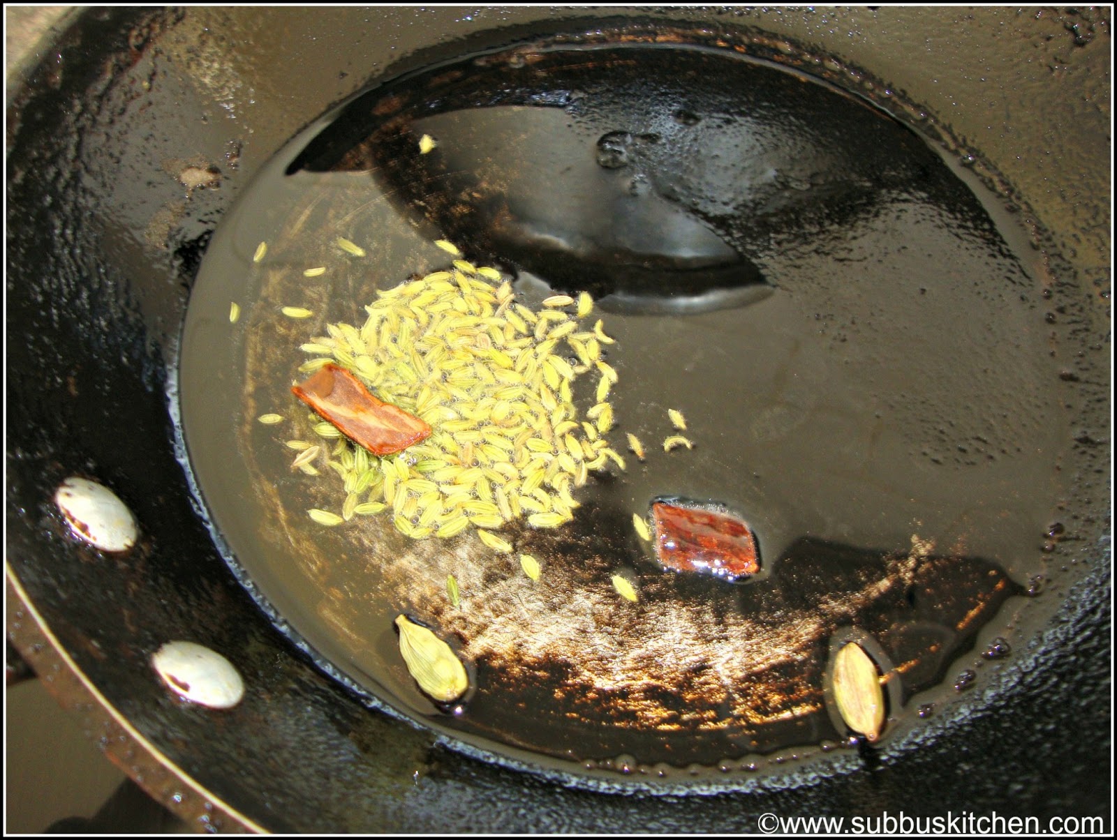 - Heat oil in a pan, add fennel seeds when the oil is hot. Add cinnamon sticks and cardamom and fry it till the fennel seeds starts to sputter
