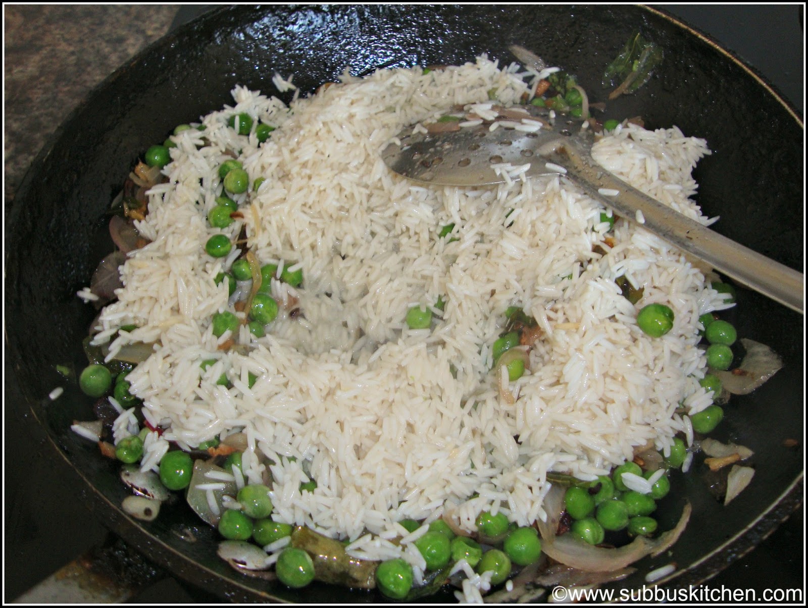 - Drain the water from soaked rice and add the rice to the pan and fry for 2 minutes