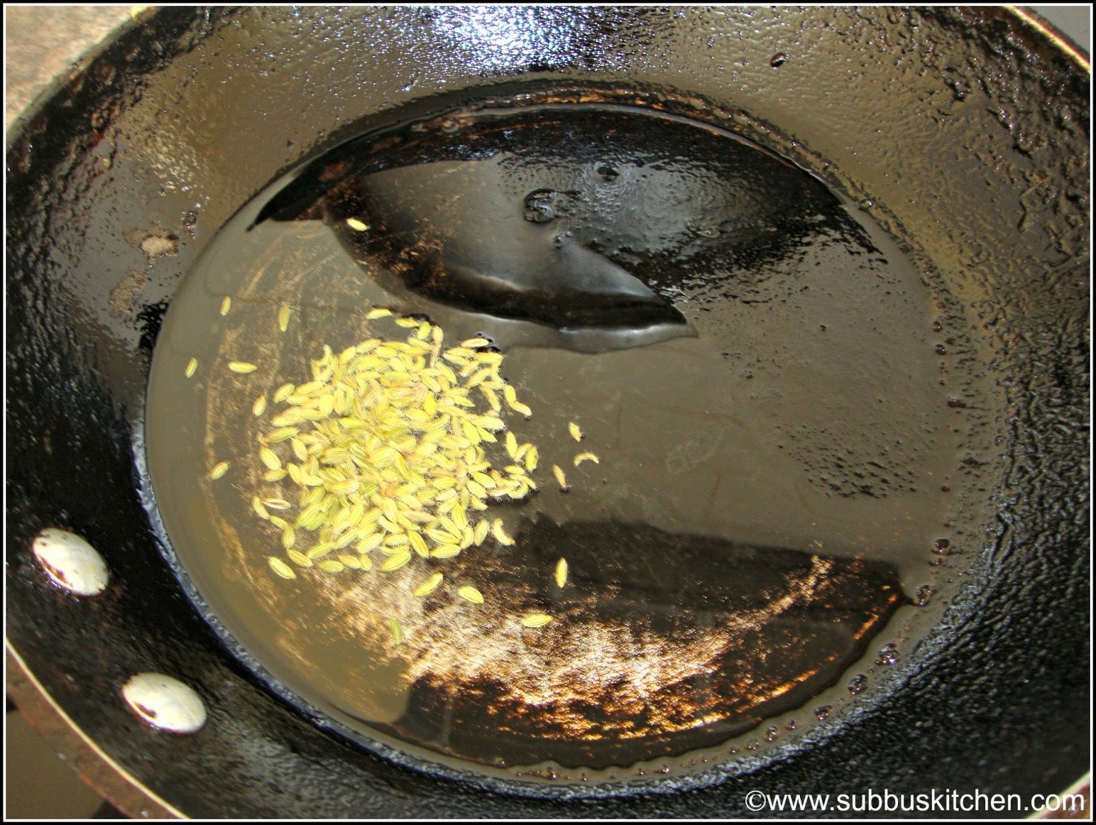 - Heat oil in a pan, add fennel seeds when the oil is hot.