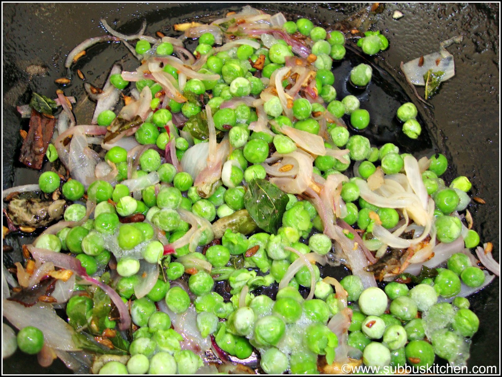 - Add chopped onions and a pinch of salt and fry it till it turns transparent. To this add peas and fry for another 20 seconds