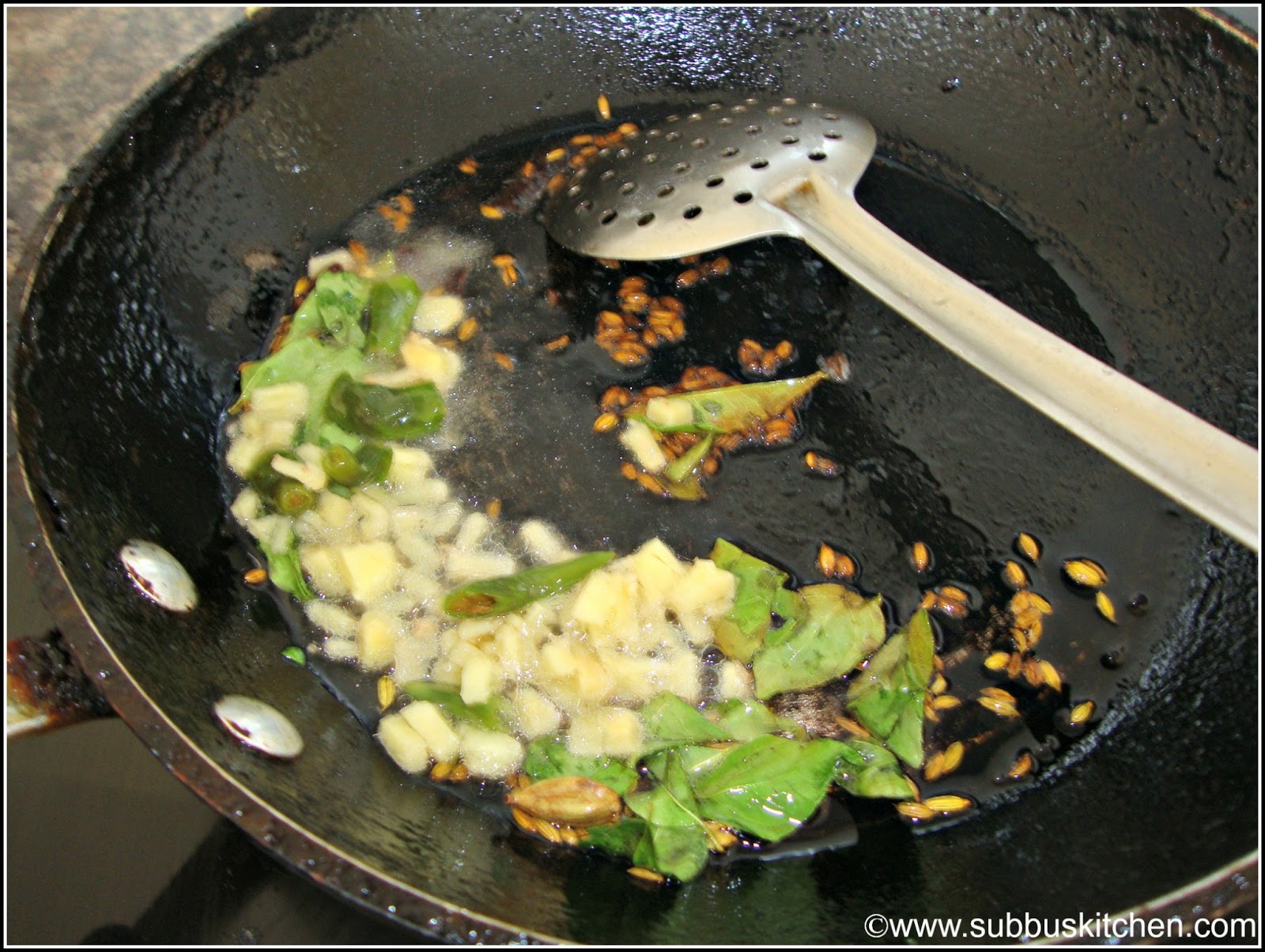 - Now add cloves and curry leaves and fry for a minute. Add chopped ginger and fry for about 20 seconds