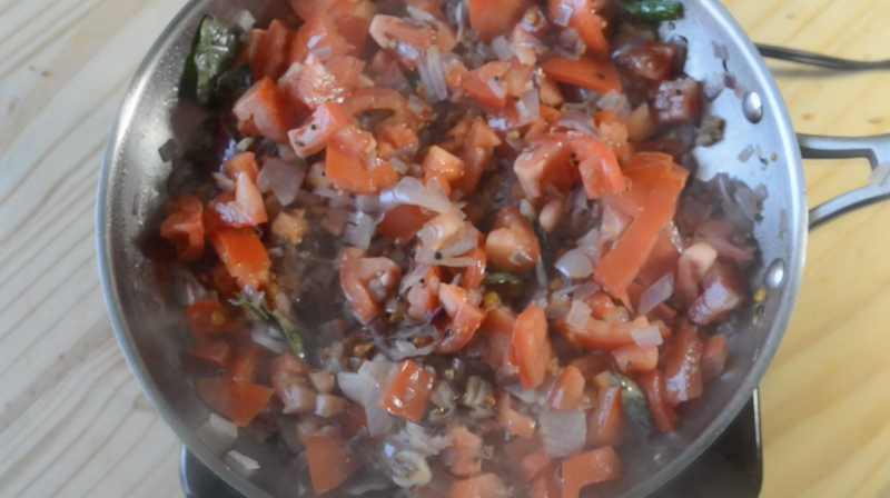 - Now add turmeric powder, sambar powder and necessary salt and allow the tomatoes to cook till the tomatoes are mushy and the oil starts to ooze out.