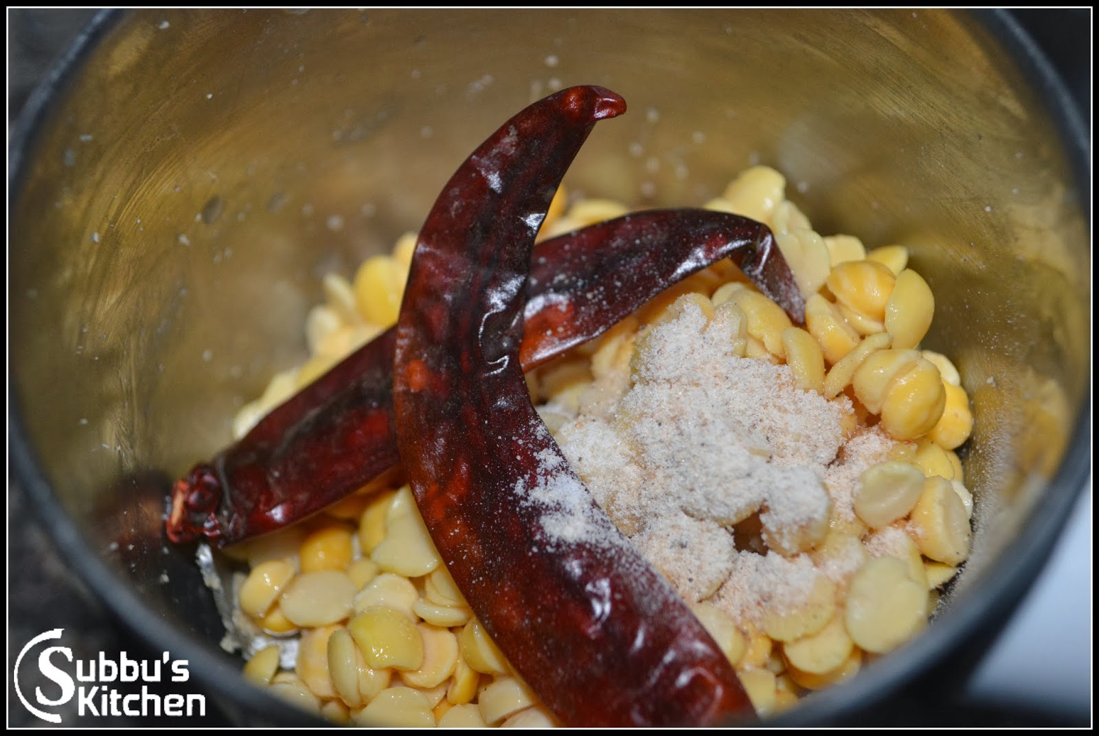 - Soak the Dal's in water over night or in hot boiling water for at least 2 hours. Rinse the Dal's and strain the water and grind it in mixer once along with red chilli, hing and salt without adding water