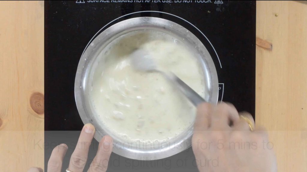 - Add salt and Keep the curd mixture in low flame and start stirring continuously for 5 mins.