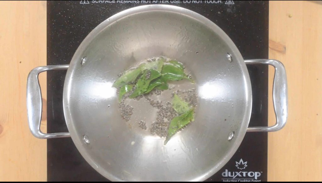 - Heat oil in a pan. Add mustard seeds and allow it to sputter. Throw in curry leaves and switch off the flame.