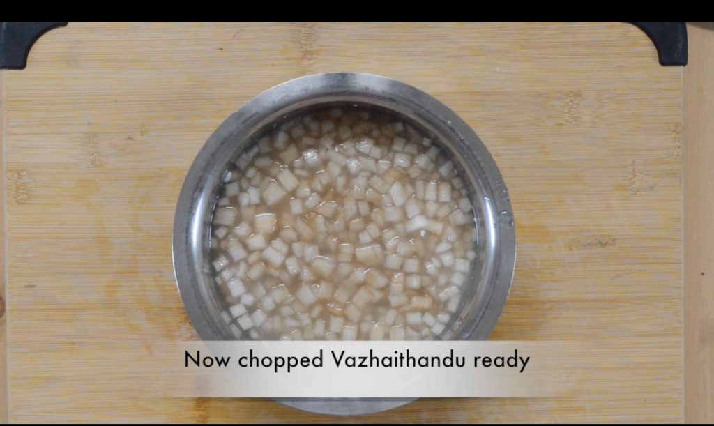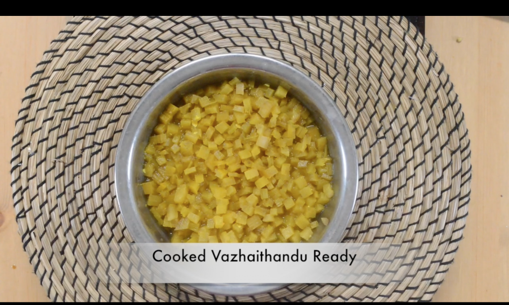 - Pressure cook vazhaithandu allowing for 3 whistles.