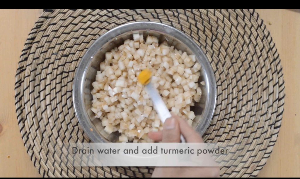 - Drain the soaked butter milk and add fresh water along with turmeric powder