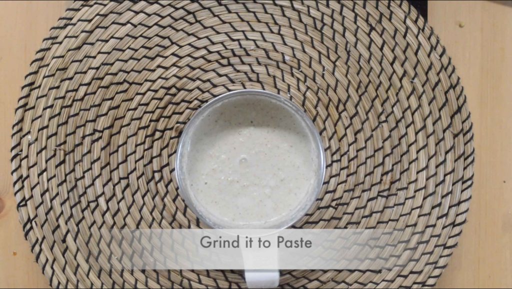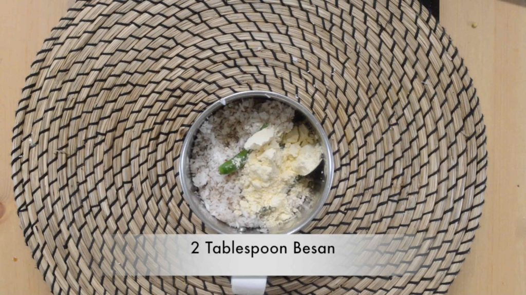 - In a mixer jar, take grated coconut, cumin seeds, green chili and besan and grind everything to a fine paste